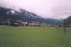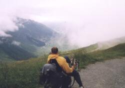 Bei üblem Wetter kämpften wir uns bis Disentis durch: das hat uns aber allen dreien gereicht! Tinka fragte den Tankwart an einer geschlossenen Tankstelle (Sie hat aber auch ein Talent, die Richtigen zu finden!), der uns die Pension Schuoler empfahl und auch gerne für uns dort anrief. Wir müssen aber auch einen mitleiderweckenden Eindruck gemacht haben, so nass in dieser Kälte mittlerweile. Diese Pension war jedenfalls der richtige Griff: eine schon recht alte Dame bewirtschaftete sie alleine, sie stellte extra wegen uns die Heizung an (Im Juli!!! Meingott, was eine Kälte.) und erlaubte uns, unser Zelt in der Sauna zu trocknen (In die Sauna kommt man durch die Küche, aber es ist eben schon ein altes Holzhaus, alles verwinkelt.) Am Abend bekamen wir ein Bier bei der Dame und konnten in einem Fotoalbum ihres Schwagers blättern: Bilder von schier unglaublichen Schneemassen auf dem Oberalppass im Winter 1939/40, als Strasse und Bahnstrecke nur mit viel Arbeit, Schneetunneln und dergleichen offengehalten werden konnten.
