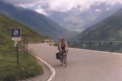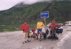 Morgens versah uns die nette alte Dame mit einem guten Frühstück und reichlich Kaffee sowie Tinka mit Nadel und Faden, damit sie ihre Reifenreparatur beenden konnte (endlich wieder ein Ersatzreifen) und uns alle mit einer aufmunternden Prognose: "Das Wetter soll besser werden. Aber ich glaube das nicht. Das sieht aus, wie wenn der Schnee kommt." Na, zum Glück lag Wettervorhersage besser als die Wirtin, es hörte wieder (nahezu) auf zu regnen und die Wolken zogen sich rund 100 Meter nach oben zurück. Wir brachen spät auf (halb elf?) und fanden nach der Beschreibung der Wirtin auch tatsächlich einen Fahrradhändler, der sich noch auf Schlauchreifen verstand ("Bei diesem kalten Wetter muss man die nicht kleben.") und Tinka ordentlich Luft gab. Als wir Disentis gegen 11 verliessen, kam uns ein radelndes Paar entgegen, vom Oberalppass herunter. Huh, waren die durchgefroren, und der Pass sollte in den Wolken liegen. Zum Glück waren wir so spät dran, denn wir schoben die Wolken bei Anstieg vor uns her und hatten bis zum Pass oben freie Sicht.