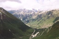 Nach den obligaten Passfotos fuhren wir ab ins warme Wallis (hier Goms, sogar Obergoms genannt) und kamen tatsächlich in den Sommer. Wir hatten schon gedacht, der dauert hier womöglich nur von Anfang August bis Mitte August. Auf gut halber Höhe, beim Belvedere am Rhonegletscher, konnten wir einen Blick von oben (!) auf den Grimsel-Pass werfen: Lang ist's her, 13 Jahre. Dann ging es weiter (auf bekannter Route) bis Oberwald und weiter Richtung Brig.