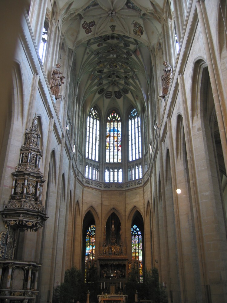 Der Chor ist höher als das Hauptschiff, beide sind kunstvoll gotisch erbaut.