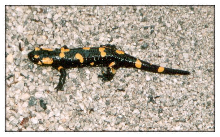 Das Regenwetter treibt allerhand Getier auf die Straße. Der Feuersalamander hat es überlebt, wir haben den Kleinen auf die andere Straßenseite geleitet.